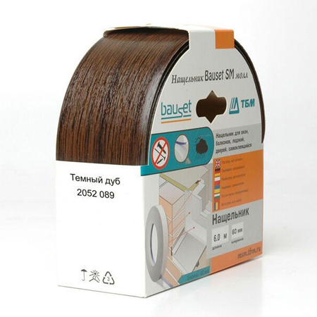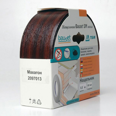 Применяется любой из видов пластиковых нащельников предварительно заламинированный в коричневые цвета (темный дуб, махагон, орегон), чаще используются самоклеящиеся нащельники этих цветов или коричневые металлические. Все эти виды применяются для наружных и для внутренних работ.